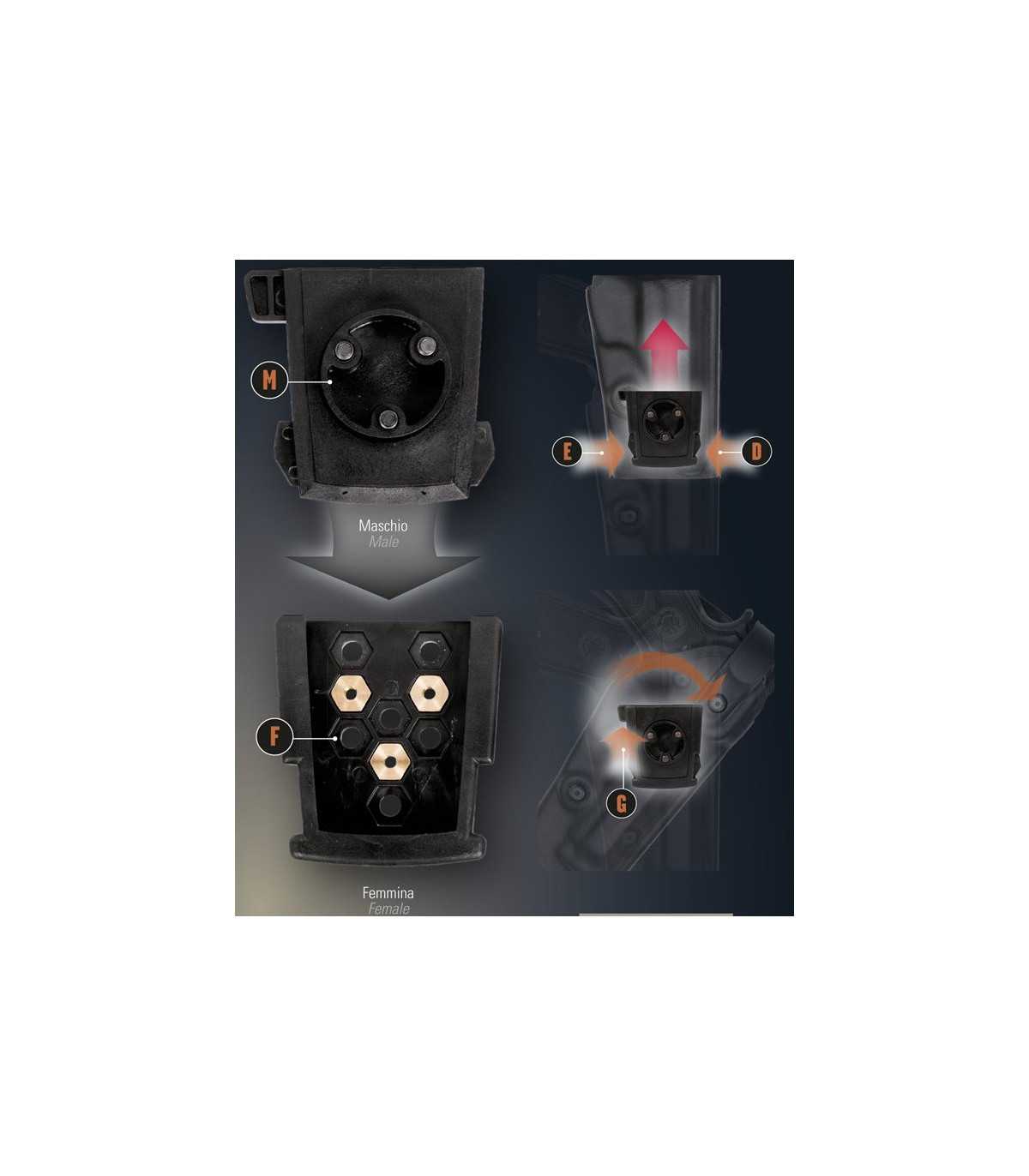 Il sistema è composto da due parti una M (maschio) fissata sulla fondina e l’altra F (femmina) fissata sul passante, piattaforma cosciale o piattaforma Molle (per schema di montaggio, passanti e fondine compatibili).