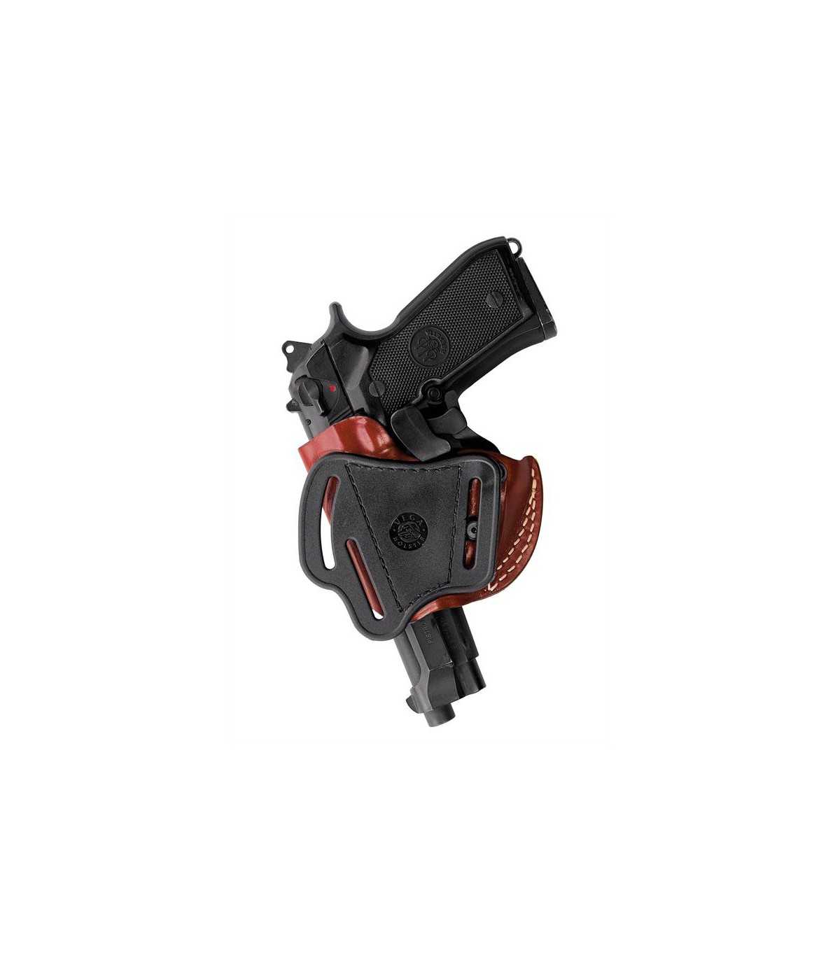 Fondina in cuoio da cintura a canna scoperta con sistema di sicurezza automatico.