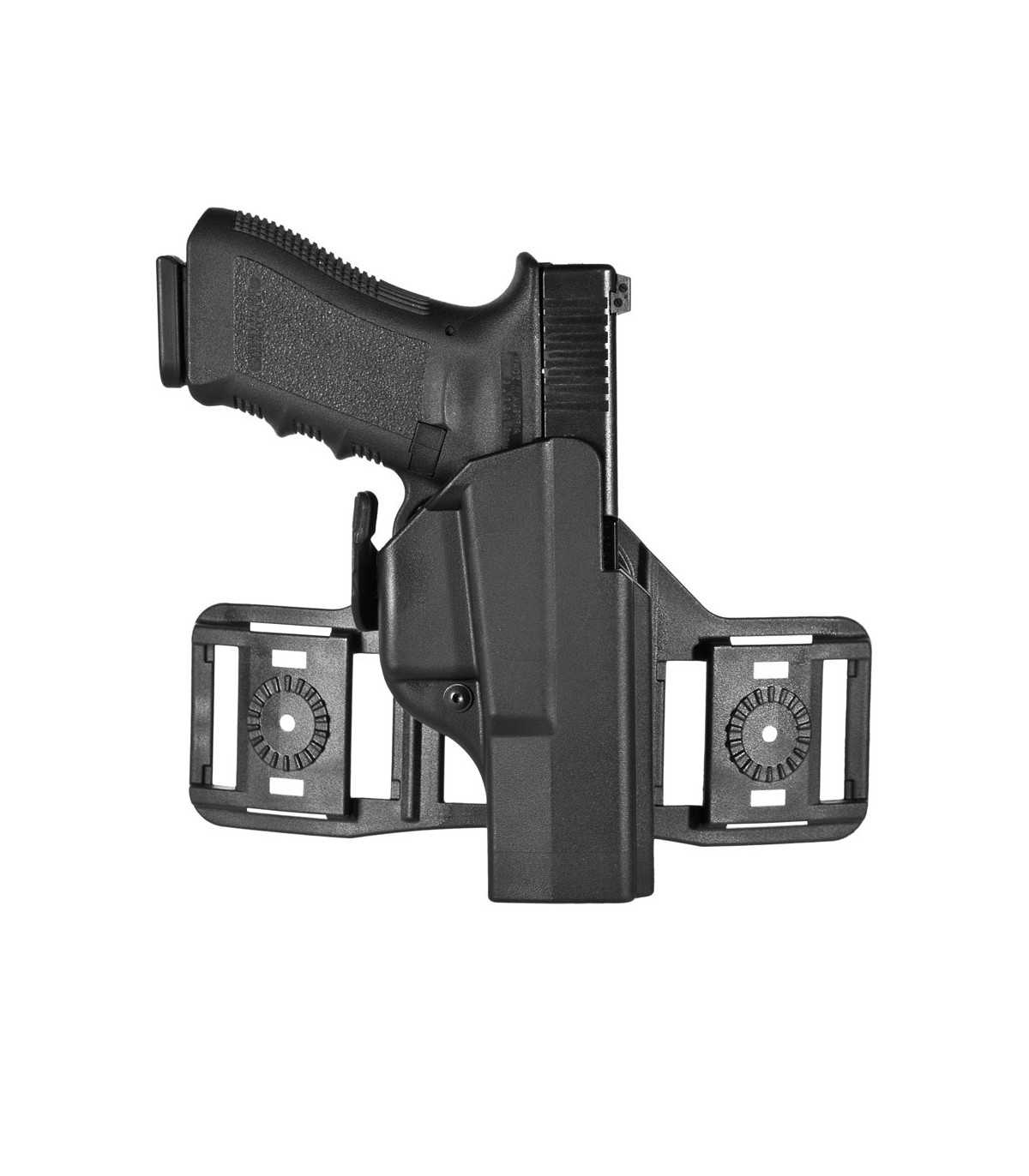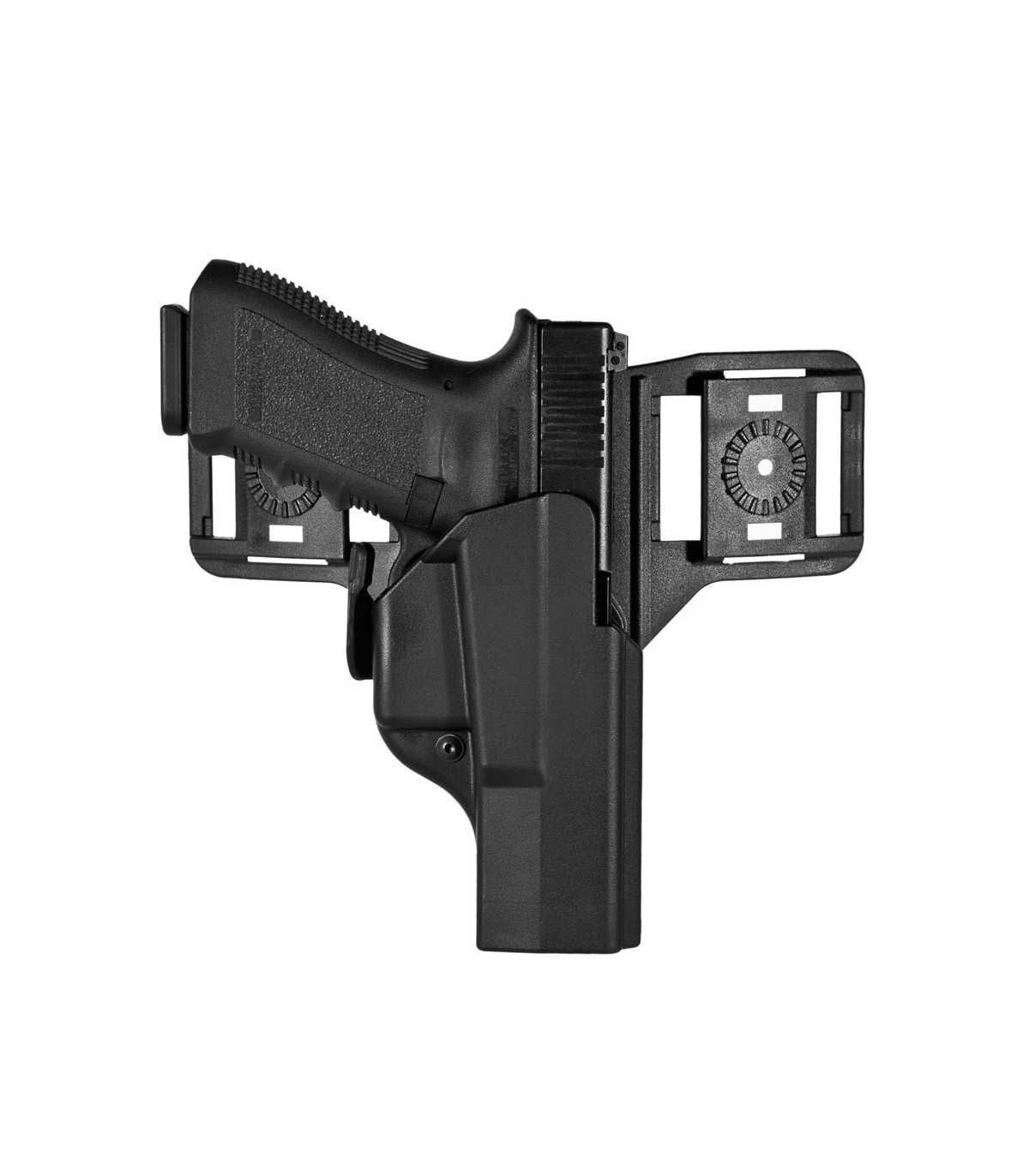 Fondina in polimero stampato a iniezione con sistema di sicura che agisce sul ponticello dell'arma.