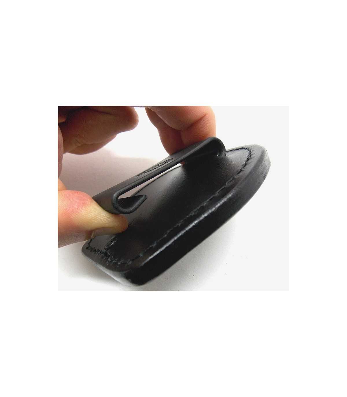 Porta placca in cuoio con molla in polimero sul retro, per attacco alla cintura