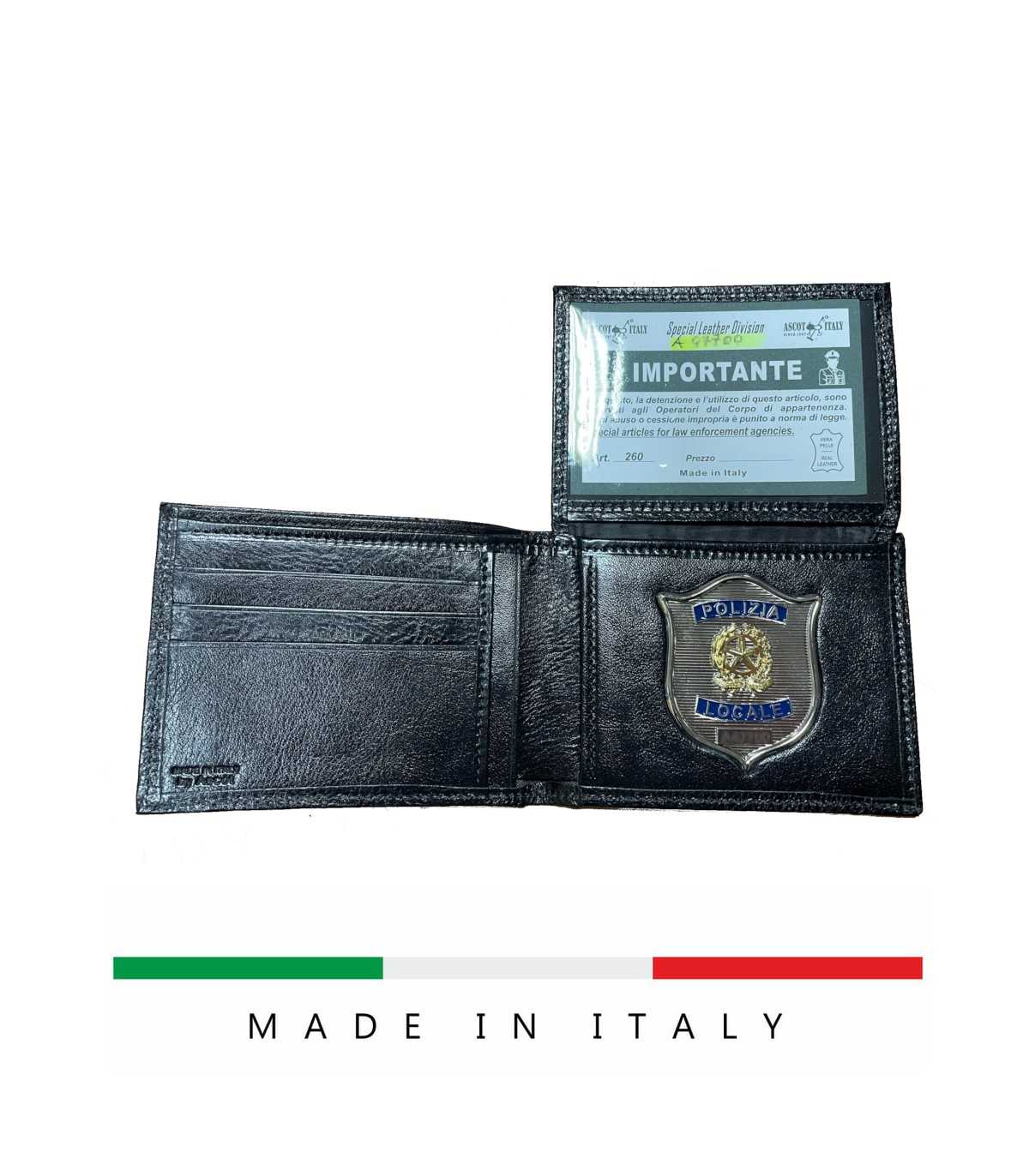 Portafoglio ASCOT orizzontale in cuoio con placca POLIZIA LOCALE con logo REPUBBLICA
