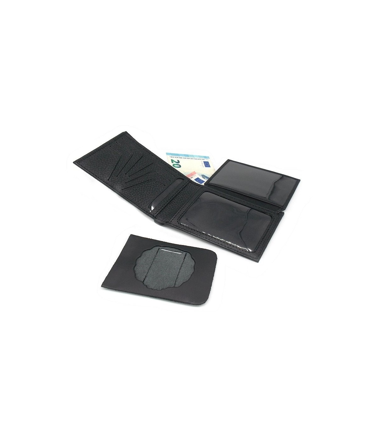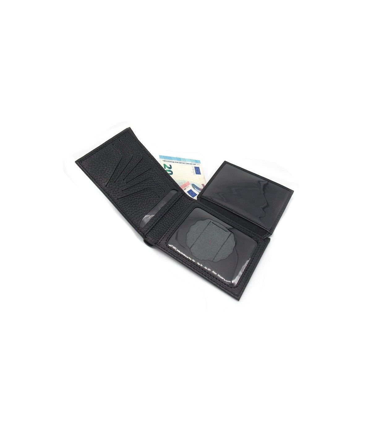 Dotato di vano portasoldi o assegni (con divisore interno), 2 vani laterali portadocumenti finestrati con plastica trasparente di cui uno usato per inserimento pattina con placca, un vano finestrato a scomparsa portadocumenti (che copre il vano portaplacca)